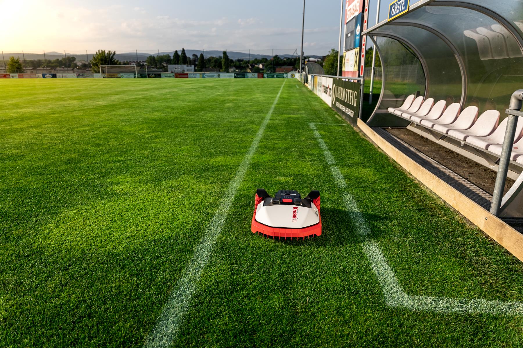 Få de flotteste fodboldbaner. Uden unædigt brug af store tunge maskiner. Samtidigt kan det være en Co2 neutral drifts-løsning. Med de store hjul der er på robotten, holder den banen flot og jævn. Alt efter jordbund kan det være nødvendigt at tromle enkelte gange i løbet af året hvis der ønskes en endnu højere standard. Lyder dette interessent så kontakt os.....