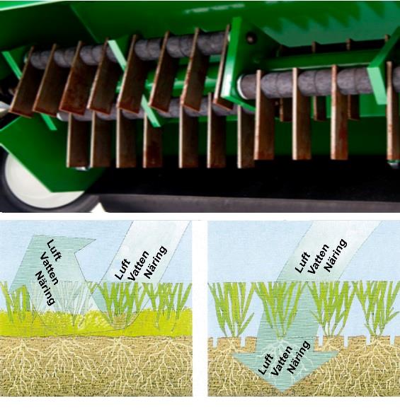 Kraftig benzindrevet vertikalskærer, der skærer smalle riller lodret ned i græsmåtten, der giver luft og lys til rødderne. Det fremmer skuddannelsen og giver dig en sund og tættere plæne. Når du vertikalskærer, løsner du også automatisk en stor del af det mos, der er i plænen. Det er en god ide at gøde efter denne behandling.